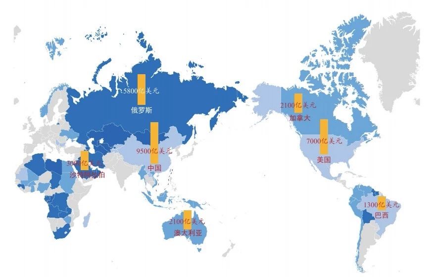 ● 美国、俄罗斯、中国是全球主要矿业大国。2018年,三国矿产资源总产量占全球49%,总产值占全球40%。