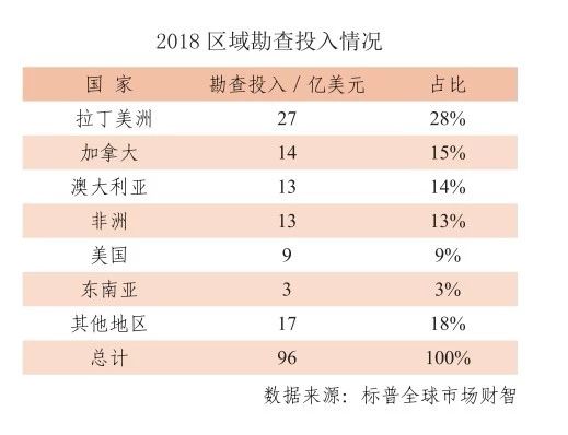 近3年,秘鲁和巴西的勘查投入占比持续上升,2018年,秘鲁的大型铜矿项目和巴西具有竞争力的铁矿石项目已经成为拉美矿业投资的主要驱动力。