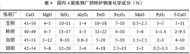 钢铁冶金渣部分种类典型化学成分、矿物组成见表3、表4、表5。