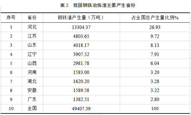 “十三五”期间我国钢铁产业不再以单纯的布局调整为主,而是将产业升级做为主旋律。据统计2018年,我国钢铁冶炼渣产出量居前五位的省份分别为河北、江苏、山东、辽宁和山西,其产出总量占全国总产生量的60%左右,其中,仅河北一省的钢铁冶炼渣产生量占到了全国产生总量的四分之一以上。我国主要省份具体产出情况如表2所示。